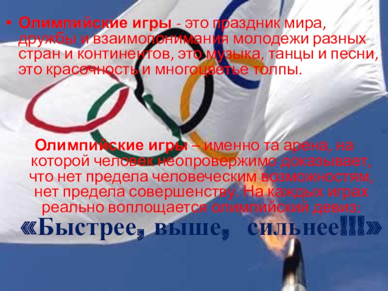 Олимпийские игры – именно та арена, на которой человек неопровержимо доказывает, что нет предела человеческим возможностям, нет предела совершенству. На каждых играх реально воплощается олимпийский девиз: «Быстрее, выше, сильнее!!!»