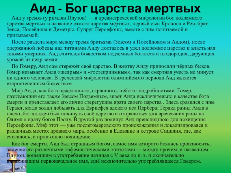 в древнегреческой мифологии бог подземного царства мёртвых и название самого царства мёртвых, первый сын Кроноса и Реи, брат Зевса, Посейдона и Деметры. Супруг Персефоны, вместе с ним почитаемой и призываемой.