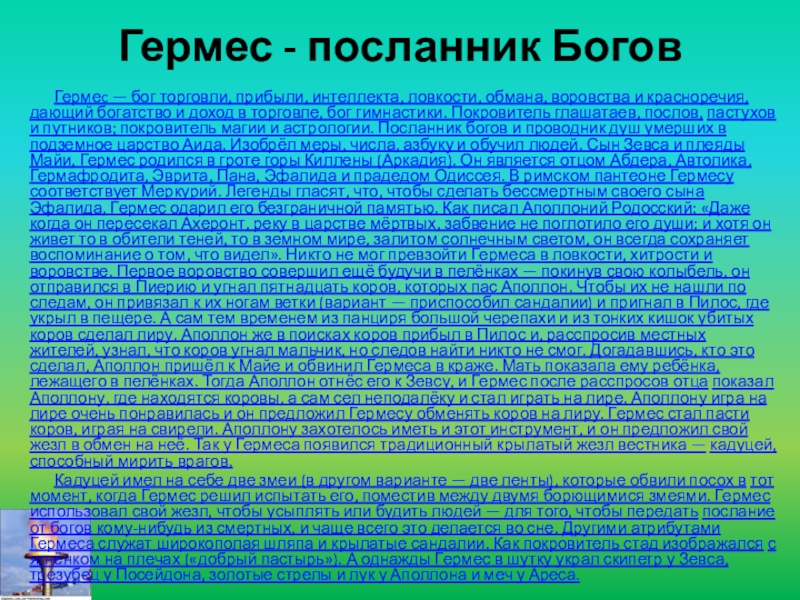 воровства и красноречия, дающий богатство и доход в торговле, бог гимнастики. Покровитель глашатаев, послов, пастухов и путников; покровитель магии и астрологии. Посланник богов и проводник душ умерших в подземное царство Аида. Изобрёл меры, числа, азбуку и обучил людей. Сын Зевса и плеяды Майи, Гермес родился в гроте горы Киллены (Аркадия). Он является отцом Абдера, Автолика, Гермафродита, Эврита, Пана, Эфалида и прадедом Одиссея. В римском пантеоне Гермесу соответствует Меркурий. Легенды гласят, что, чтобы сделать бессмертным своего сына Эфалида, Гермес одарил его безграничной памятью. Как писал Аполлоний Родосский: «Даже когда он пересекал Ахеронт, реку в царстве мёртвых, забвение не поглотило его души; и хотя он живет то в обители теней, то в земном мире, залитом солнечным светом, он всегда сохраняет воспоминание о том, что видел». Никто не мог превзойти Гермеса в ловкости, хитрости и воровстве. Первое воровство совершил ещё будучи в пелёнках — покинув свою колыбель, он отправился в Пиерию и угнал пятнадцать коров, которых пас Аполлон. Чтобы их не нашли по следам, он привязал к их ногам ветки (вариант — приспособил сандалии) и пригнал в Пилос, где укрыл в пещере. А сам тем временем из панциря большой черепахи и из тонких кишок убитых коров сделал лиру. Аполлон же в поисках коров прибыл в Пилос и, расспросив местных жителей, узнал, что коров угнал мальчик, но следов найти никто не смог. Догадавшись, кто это сделал, Аполлон пришёл к Майе и обвинил Гермеса в краже. Мать показала ему ребёнка, лежащего в пелёнках. Тогда Аполлон отнёс его к Зевсу, и Гермес после расспросов отца показал Аполлону, где находятся коровы, а сам сел неподалёку и стал играть на лире. Аполлону игра на лире очень понравилась и он предложил Гермесу обменять коров на лиру. Гермес стал пасти коров, играя на свирели. Аполлону захотелось иметь и этот инструмент, и он предложил свой жезл в обмен на неё. Так у Гермеса появился традиционный крылатый жезл вестника — кадуцей, способный мирить врагов.