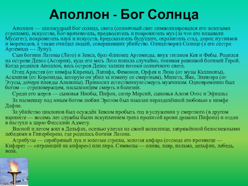Аполлон — златокудрый бог солнца, света (солнечный свет
