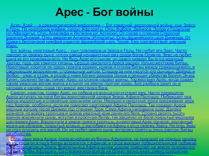 коварной, вероломной войны, сын Зевса и Геры. По некоторым мифам, супруг Афродиты. Отец Фобоса, Деймоса, Эроса и Гармонии (от Афродиты). Отец Аскалафа и Иялмена (от Астиохи). От союза с плеядой Стеропой родился Эномай. Отец амазонки Антиопы (Ипполиты). Отец фракийского царя Диомеда. От брака с бистонской нимфой родился фракийский царь Терей. Ему соответствует римский Марс.