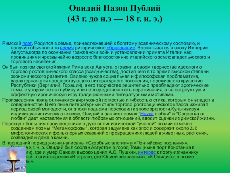 В конце 8 г. н. э. Овидий был сослан Августом в город Томы (ныне порт Констанца в Румынии), где и умер.Овидия высоко ценил А.С. Пушкин, интерес к поэту-изгнаннику отразился в стиотворении «В стране, где Юлией венчанный», «К Овидию», в поэме «Цыганы».
