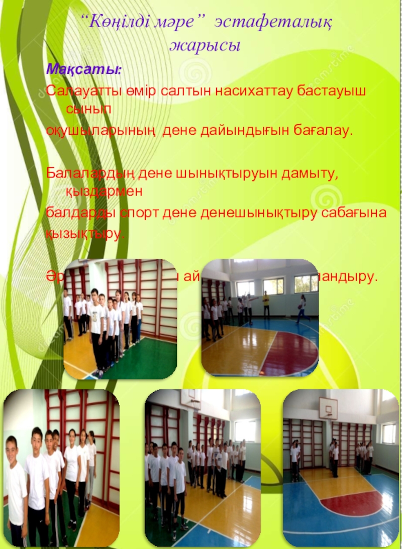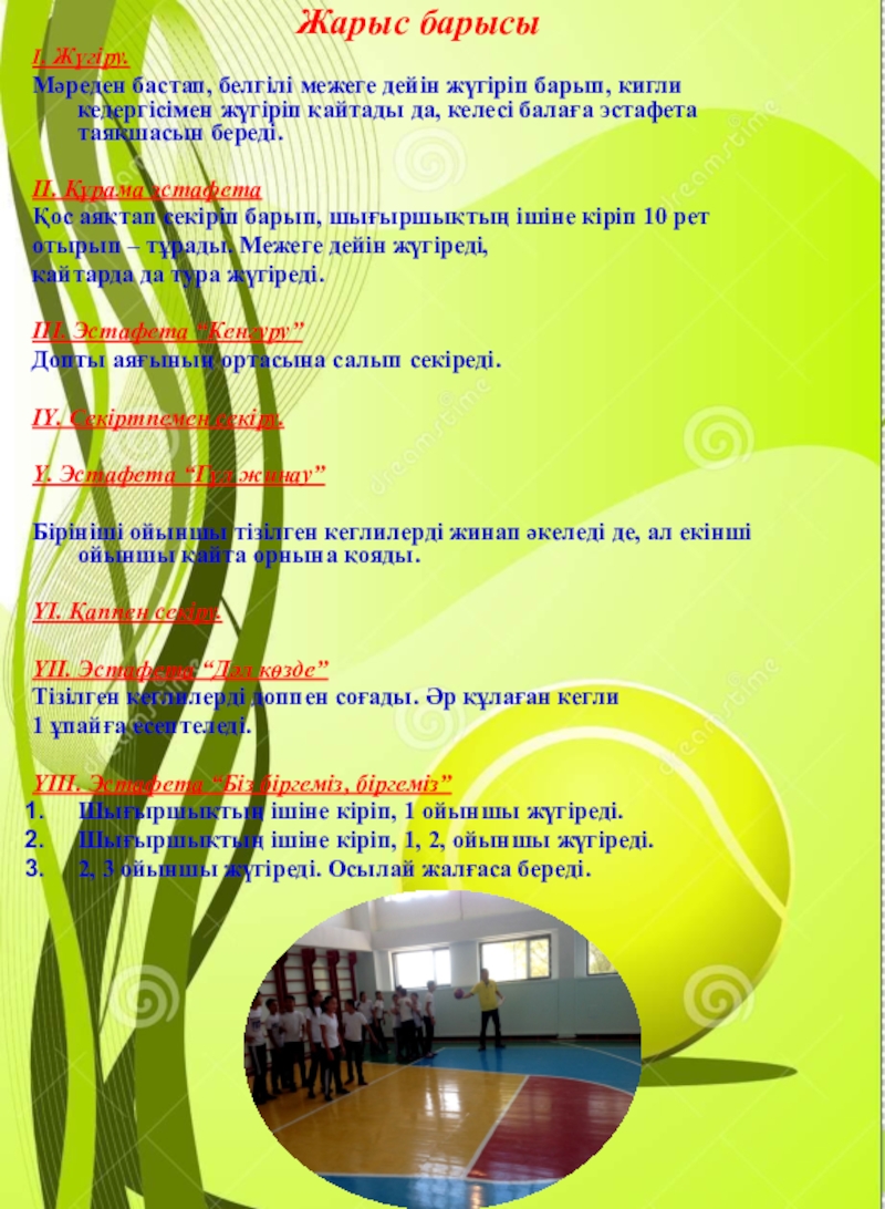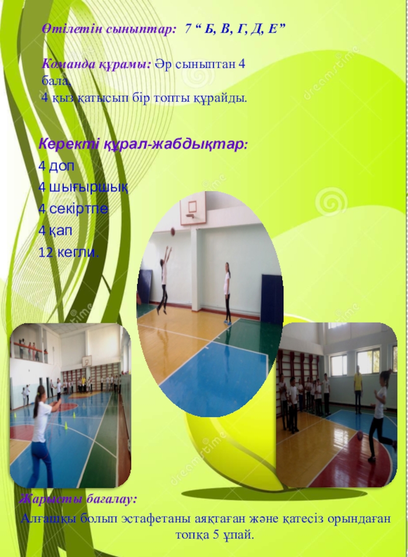 Алғашқы болып эстафетаны аяқтаған және қатесіз орындаған топқа 5 ұпай.