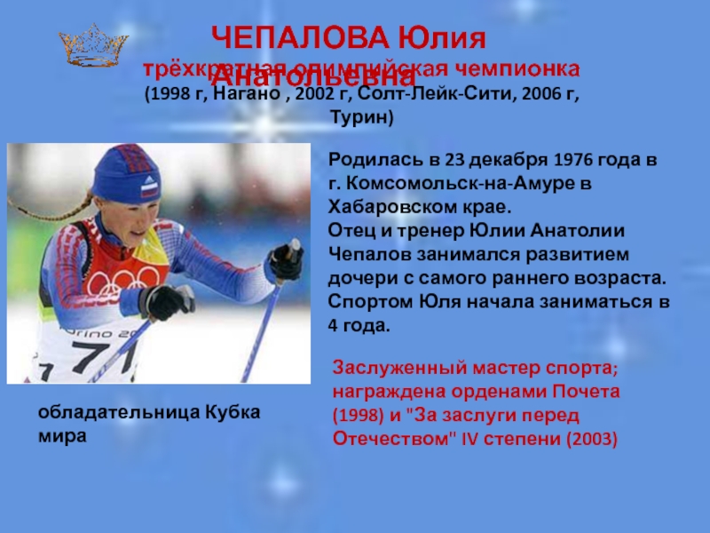 (1998 г, Нагано , 2002 г, Солт-Лейк-Сити, 2006 г, Турин)