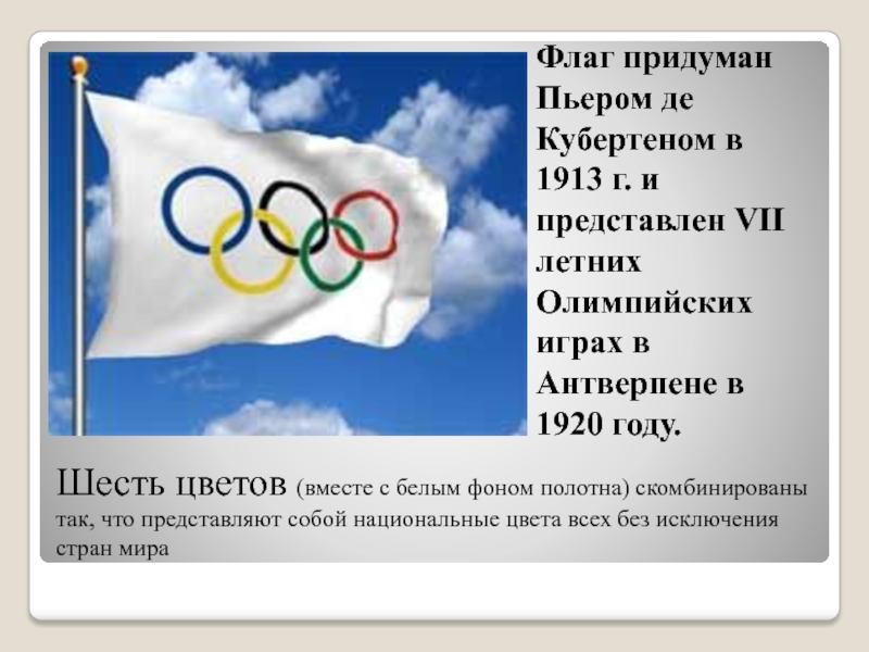 Флаг придуман Пьером де Кубертеном в 1913 г. и представлен VII летних Олимпийских играх в Антверпене в 1920 году.