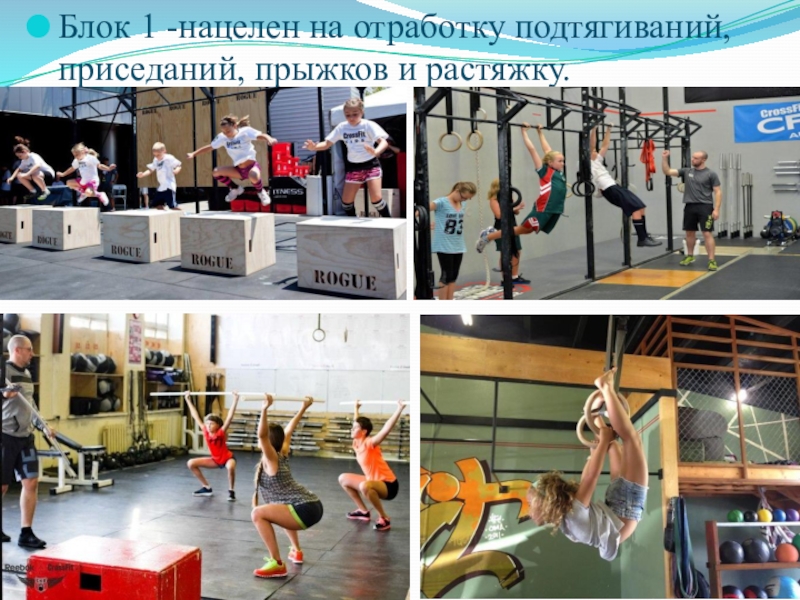 Слайд 14Блок 1 -нацелен на отработку подтягиваний, приседаний, прыжков и растяжку.
