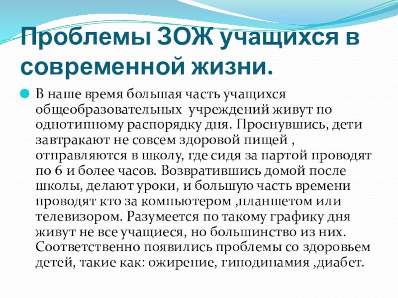 Слайд 2Проблемы ЗОЖ учащихся в современной жизни.