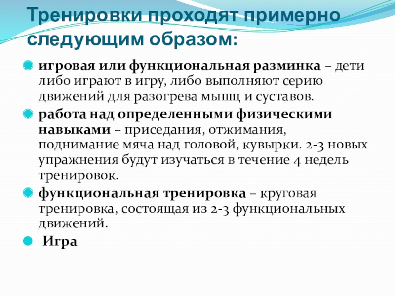 работа над определенными физическими навыками – приседания, отжимания, поднимание мяча над головой, кувырки. 2-3 новых упражнения будут изучаться в течение 4 недель тренировок.