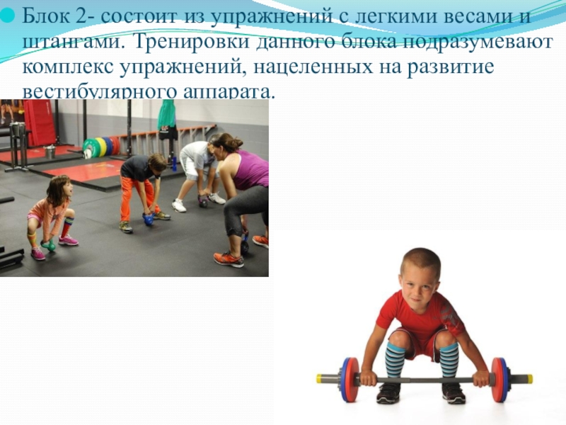 Слайд 15Блок 2- состоит из упражнений с легкими весами и штангами. Тренировки