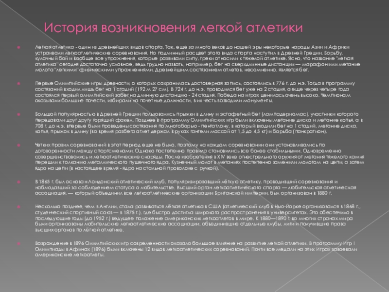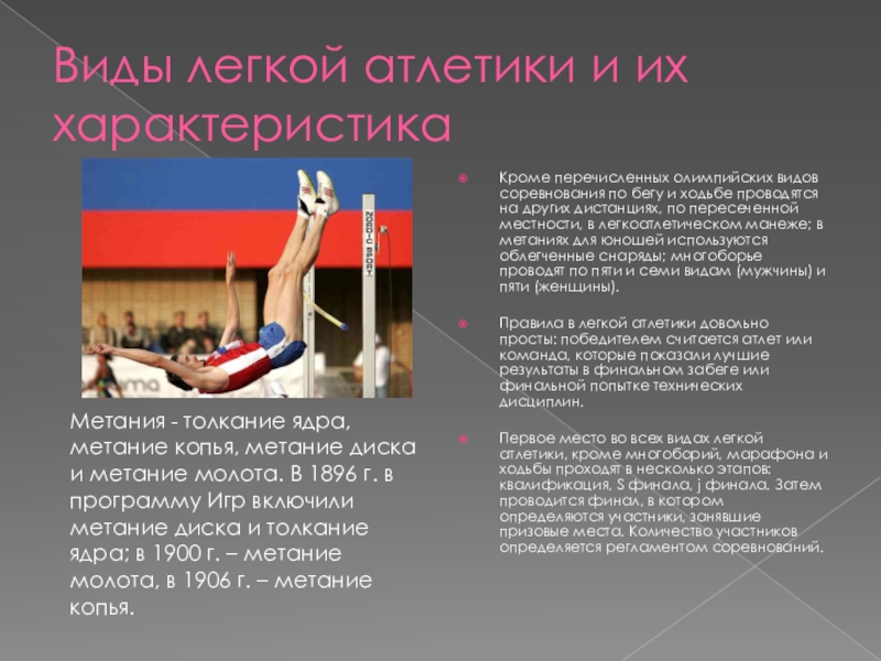 Метания - толкание ядра, метание копья, метание диска и метание молота. В 1896 г. в программу Игр включили метание диска и толкание ядра; в 1900 г. – метание молота, в 1906 г. – метание копья.