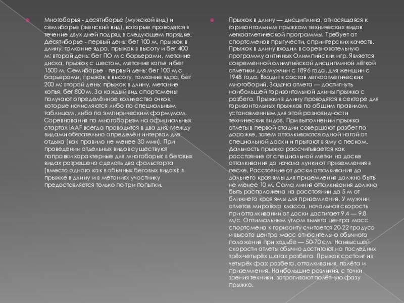 Многоборья - десятиборье (мужской вид) и семиборье (женский вид), которые проводятся в течение двух дней подряд в следующем порядке. Десятиборье - первый день: бег 100 м, прыжок в длину, толкание ядра, прыжок в высоту и бег 400 м; второй день: бег ПО м с барьерами, метание диска, прыжок с шестом, метание копья и бег 1500 м. Семиборье - первый день: бег 100 м с барьерами, прыжок в высоту, толкание ядра, бег 200 м; второй день: прыжок в длину, метание копья, бег 800 м. За каждый вид спортсмены получают определённое количество очков, которые начисляются либо по специальным таблицам, либо по эмпирическим формулам. Соревнования по многоборьям на официальных стартах IAAF всегда проводится в два дня. Между видами обязательно определён интервал для отдыха (как правило не менее 30 мин). При проведении отдельных видов существуют поправки характерные для многоборья: в беговых видах разрешено сделать два фальстарта (вместо одного как в обычных беговых видах); в прыжке в длину и в метаниях участнику предоставляется только по три попытки.