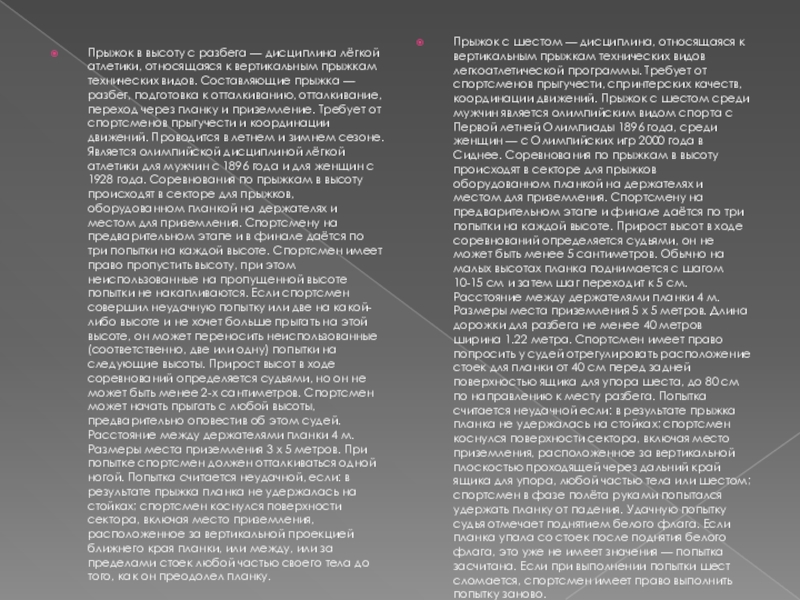 Прыжок с шестом — дисциплина, относящаяся к вертикальным прыжкам технических видов легкоатлетической программы. Требует от спортсменов прыгучести, спринтерских качеств, координации движений. Прыжок с шестом среди мужчин является олимпийским видом спорта с Первой летней Олимпиады 1896 года, среди женщин — с Олимпийских игр 2000 года в Сиднее. Соревнования по прыжкам в высоту происходят в секторе для прыжков оборудованном планкой на держателях и местом для приземления. Спортсмену на предварительном этапе и финале даётся по три попытки на каждой высоте. Прирост высот в ходе соревнований определяется судьями, он не может быть менее 5 сантиметров. Обычно на малых высотах планка поднимается с шагом 10-15 см и затем шаг переходит к 5 см. Расстояние между держателями планки 4 м. Размеры места приземления 5 x 5 метров. Длина дорожки для разбега не менее 40 метров ширина 1.22 метра. Спортсмен имеет право попросить у судей отрегулировать расположение стоек для планки от 40 см перед задней поверхностью ящика для упора шеста, до 80 см по направлению к месту разбега. Попытка считается неудачной если: в результате прыжка планка не удержалась на стойках; спортсмен коснулся поверхности сектора, включая место приземления, расположенное за вертикальной плоскостью проходящей через дальний край ящика для упора, любой частью тела или шестом; спортсмен в фазе полёта руками попытался удержать планку от падения. Удачную попытку судья отмечает поднятием белого флага. Если планка упала со стоек после поднятия белого флага, это уже не имеет значения — попытка засчитана. Если при выполнении попытки шест сломается, спортсмен имеет право выполнить попытку заново.