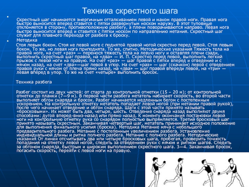 правой ноги. Правая нога быстро выносится вперед ставится с пятки развернутым носком наружу. В этот туловище отклоняется в сторону, противоположную разбегу, а плечи поворачиваются направо. Левая нога быстро выносится вперед и ставится с пятки носком по направлению метания. Скрестный шаг служит для плавного перехода от разбега к броску.