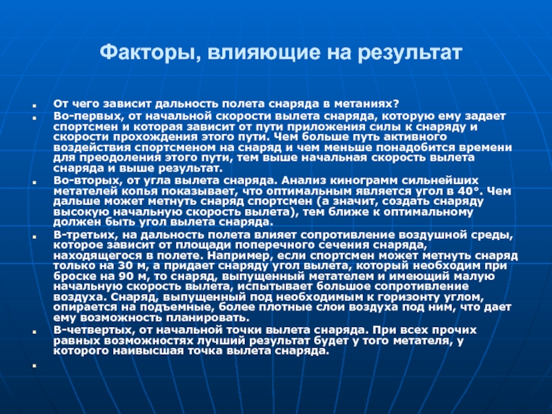 от начальной скорости вылета снаряда, которую ему задает спортсмен и которая зависит от пути приложения силы к снаряду и скорости прохождения этого пути. Чем больше путь активного воздействия спортсменом на снаряд и чем меньше понадобится времени для преодоления этого пути, тем выше начальная скорость вылета снаряда и выше результат.