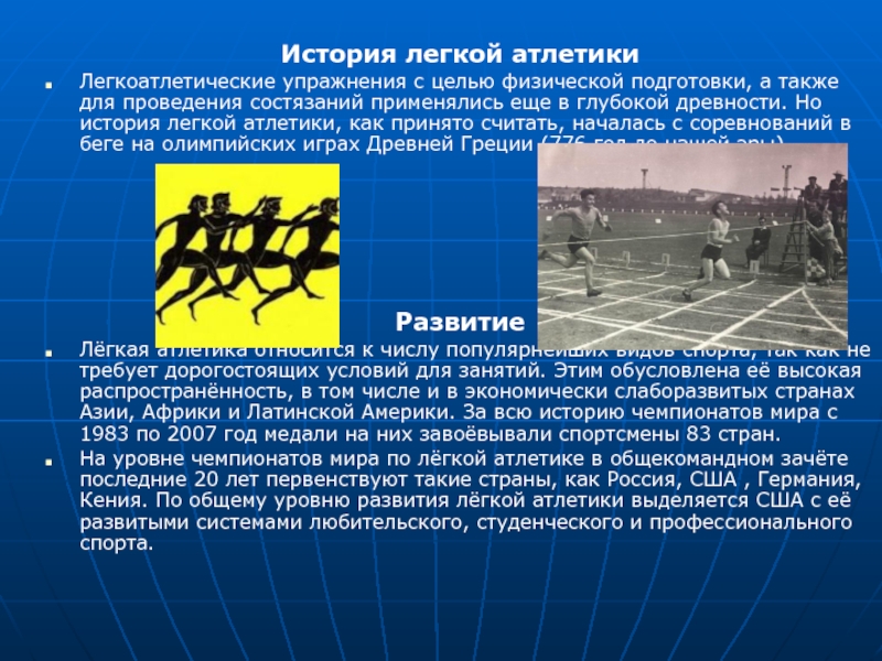 проведения состязаний применялись еще в глубокой древности. Но история легкой атлетики, как принято считать, началась с соревнований в беге на олимпийских играх Древней Греции (776 год до нашей эры).
