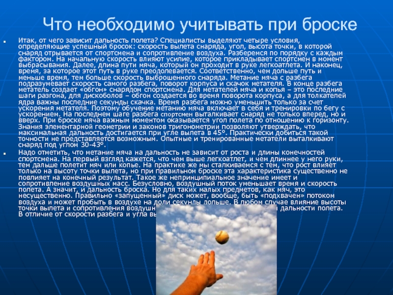 Специалисты выделяют четыре условия, определяющие успешный бросок: скорость вылета снаряда, угол, высота точки, в которой снаряд отрывается от спортсмена и сопротивление воздуха. Разберемся по порядку с каждым фактором. На начальную скорость влияют усилие, которое прикладывает спортсмен в момент выбрасывания. Далее, длина пути мяча, который он проходит в руке легкоатлета. И наконец, время, за которое этот путь в руке преодолевается. Соответственно, чем дольше путь и меньше время, тем больше скорость выброшенного снаряда. Метание мяча с разбега подразумевает скорость самого разбега, поворот корпуса и скачок метателя. В конце разбега метатель создает «обгон» снарядом спортсмена. Для метателей мяча и копья – это последние шаги разгона, для дискоболов – обгон создается во время поворота корпуса, а для толкателей ядра важны последние секунды скачка. Время разбега можно уменьшить только за счет ускорения метателя. Поэтому обучение метанию мяча включает в себя и тренировки по бегу с ускорением. На последнем шаге разбега спортсмен выталкивает снаряд не только вперед, но и вверх. При броске мяча важным моментом оказывается угол полета по отношению к горизонту. Знания элементарной геометрии и законов тригонометрии позволяют утверждать, что максимальная дальность достигается при угле вылета в 45°. Практически добиться такой точности не представляется возможным. Опытные и тренированные метатели выталкивают снаряд под углом 30-43°.