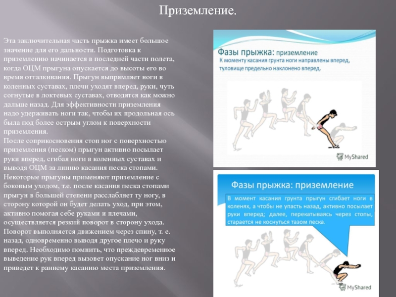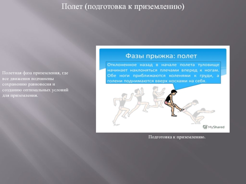Подготовка к приземлению начинается в последней части полета, когда ОЦМ прыгуна опускается до высоты его во время отталкивания. Прыгун выпрямляет ноги в коленных суставах, плечи уходят вперед, руки, чуть согнутые в локтевых суставах, отводятся как можно дальше назад. Для эффективности приземления надо удерживать ноги так, чтобы их продольная ось была под более острым углом к поверхности приземления.