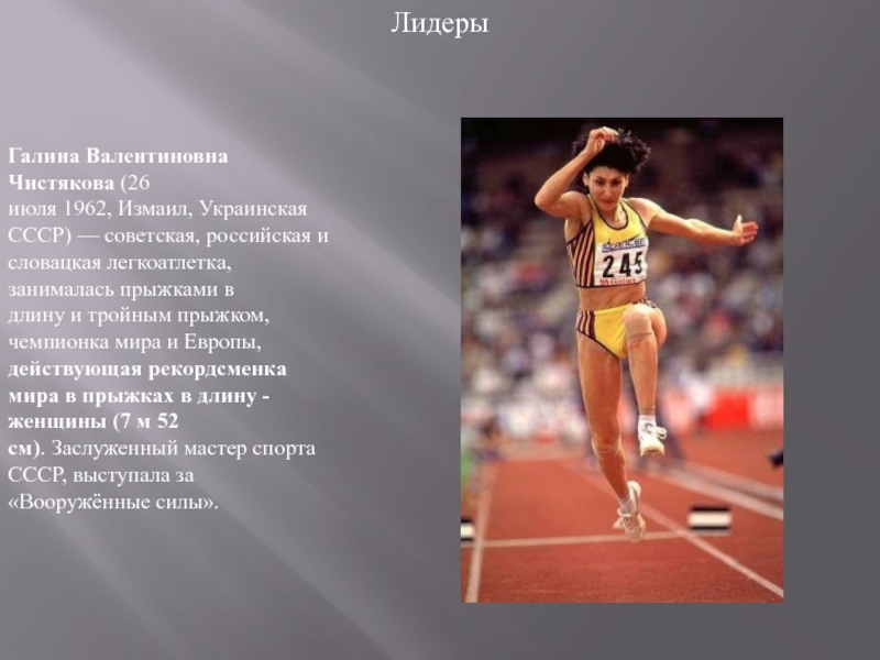 мира и Европы, действующая рекордсменка мира в прыжках в длину - женщины (7 м 52 см). Заслуженный мастер спорта СССР, выступала за «Вооружённые силы».