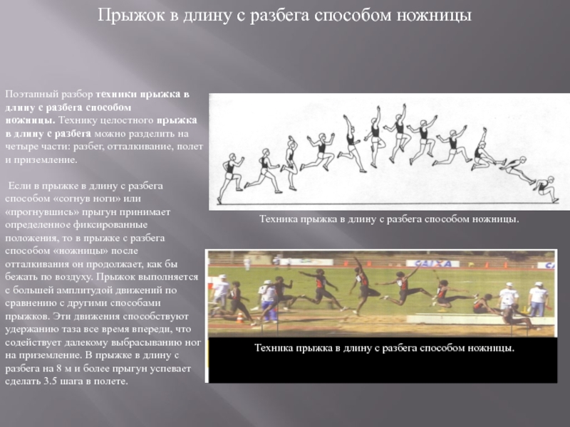 Слайд 2Поэтапный разбор техники прыжка в длину с разбега способом ножницы. Технику целостного прыжка в