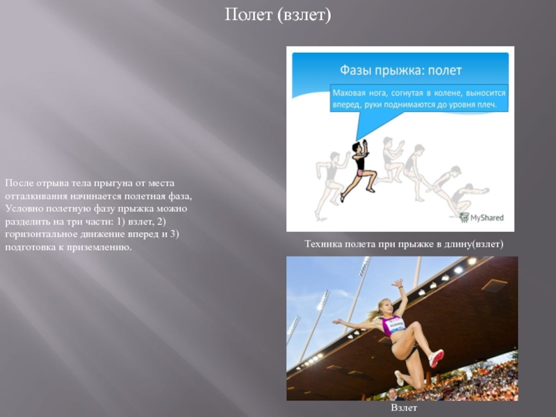 Условно полетную фазу прыжка можно разделить на три части: 1) взлет, 2) горизонтальное движение вперед и 3) подготовка к приземлению.