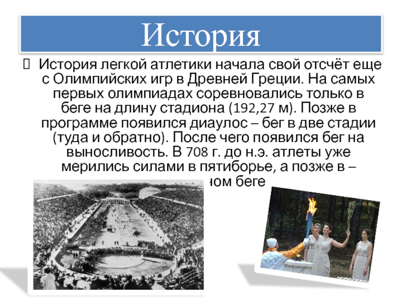 ИсторияИстория легкой атлетики начала свой отсчёт еще с Олимпийских игр в Древней Греции. На самых первых олимпиадах