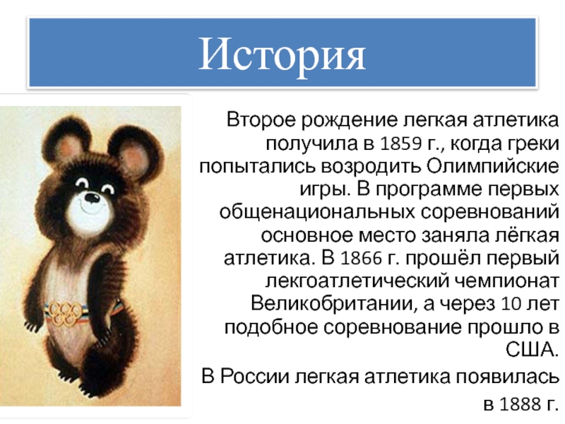 ИсторияВторое рождение легкая атлетика получила в 1859 г., когда греки попытались возродить Олимпийские игры. В программе первых