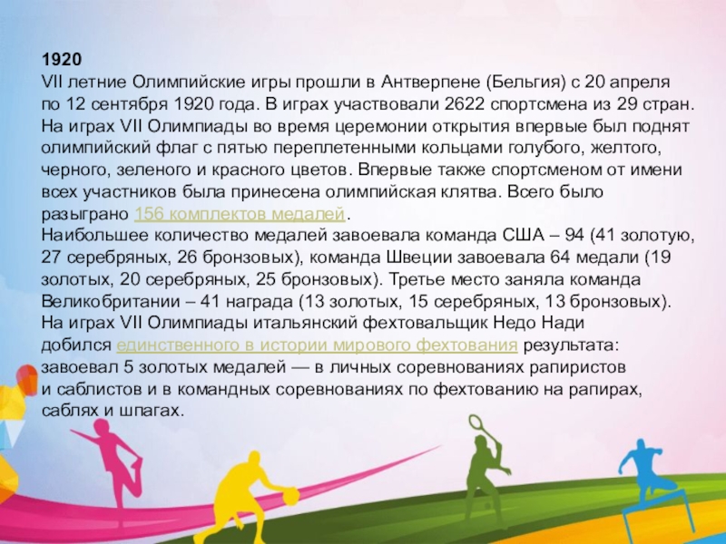 VII летние Олимпийские игры прошли в Антверпене (Бельгия) с 20 апреля по 12 сентября 1920 года. В играх участвовали 2622 спортсмена из 29 стран. На играх VII Олимпиады во время церемонии открытия впервые был поднят олимпийский флаг с пятью переплетенными кольцами голубого, желтого, черного, зеленого и красного цветов. Впервые также спортсменом от имени всех участников была принесена олимпийская клятва. Всего было разыграно 156 комплектов медалей.