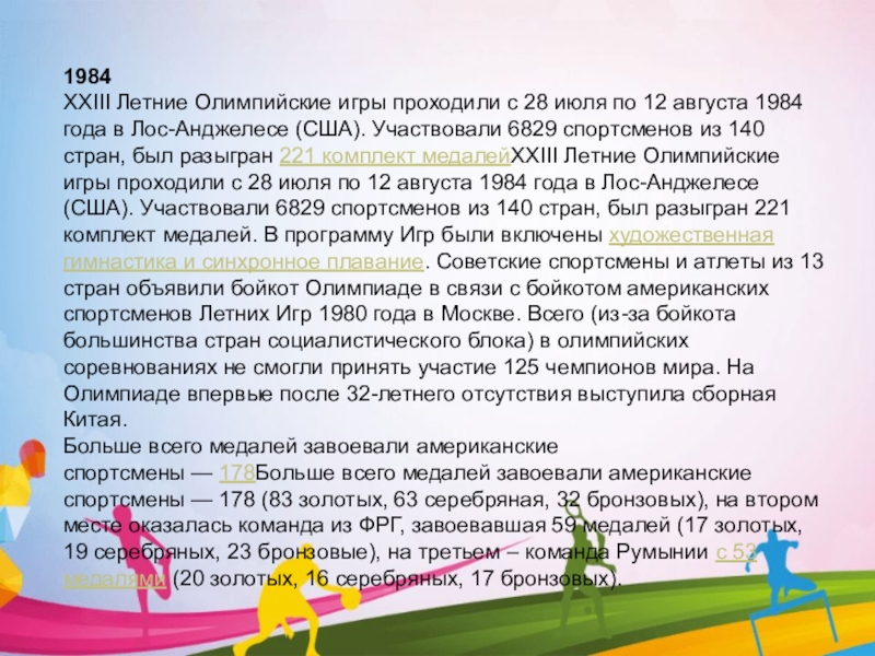 XXIII Летние Олимпийские игры проходили с 28 июля по 12 августа 1984 года в Лос-Анджелесе (США). Участвовали 6829 спортсменов из 140 стран, был разыгран 221 комплект медалейXXIII Летние Олимпийские игры проходили с 28 июля по 12 августа 1984 года в Лос-Анджелесе (США). Участвовали 6829 спортсменов из 140 стран, был разыгран 221 комплект медалей. В программу Игр были включены художественная гимнастика и синхронное плавание. Советские спортсмены и атлеты из 13 стран объявили бойкот Олимпиаде в связи с бойкотом американских спортсменов Летних Игр 1980 года в Москве. Всего (из-за бойкота большинства стран социалистического блока) в олимпийских соревнованиях не смогли принять участие 125 чемпионов мира. На Олимпиаде впервые после 32-летнего отсутствия выступила сборная Китая.