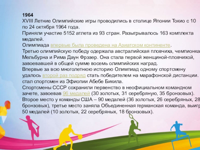 XVIII Летние Олимпийские игры проводились в столице Японии Токио с 10 по 24 октября 1964 года.