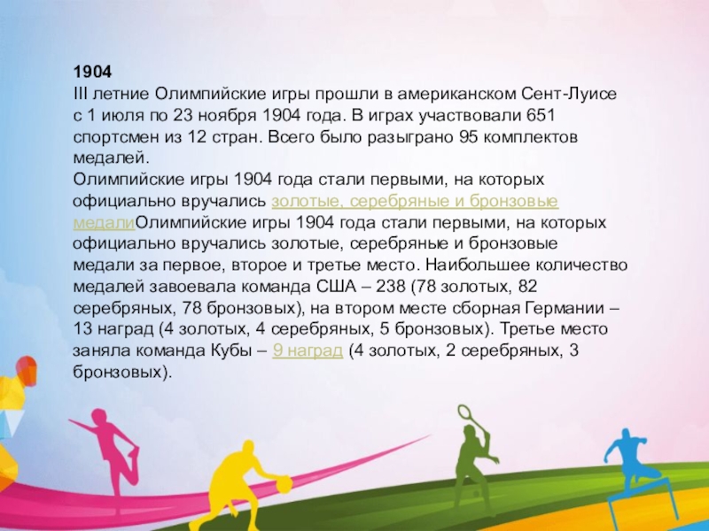 Олимпийские игры 1904 года стали первыми, на которых официально вручались золотые, серебряные и бронзовые медалиОлимпийские игры 1904 года стали первыми, на которых официально вручались золотые, серебряные и бронзовые медали за первое, второе и третье место. Наибольшее количество медалей завоевала команда США – 238 (78 золотых, 82 серебряных, 78 бронзовых), на втором месте сборная Германии – 13 наград (4 золотых, 4 серебряных, 5 бронзовых). Третье место заняла команда Кубы – 9 наград (4 золотых, 2 серебряных, 3 бронзовых).