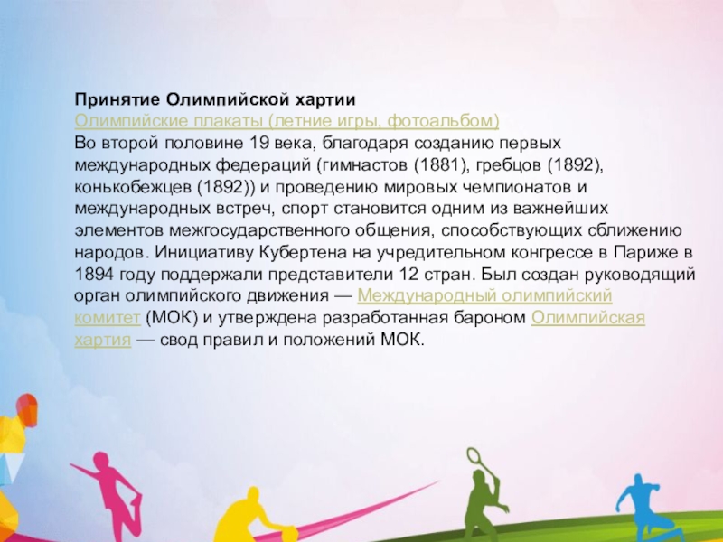 Во второй половине 19 века, благодаря созданию первых международных федераций (гимнастов (1881), гребцов (1892), конькобежцев (1892)) и проведению мировых чемпионатов и международных встреч, спорт становится одним из важнейших элементов межгосударственного общения, способствующих сближению народов. Инициативу Кубертена на учредительном конгрессе в Париже в 1894 году поддержали представители 12 стран. Был создан руководящий орган олимпийского движения — Международный олимпийский комитет (МОК) и утверждена разработанная бароном Олимпийская хартия — свод правил и положений МОК.