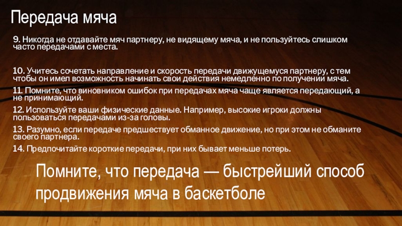 Помните, что передача — быстрейший способ продвижения мяча в баскетболе
