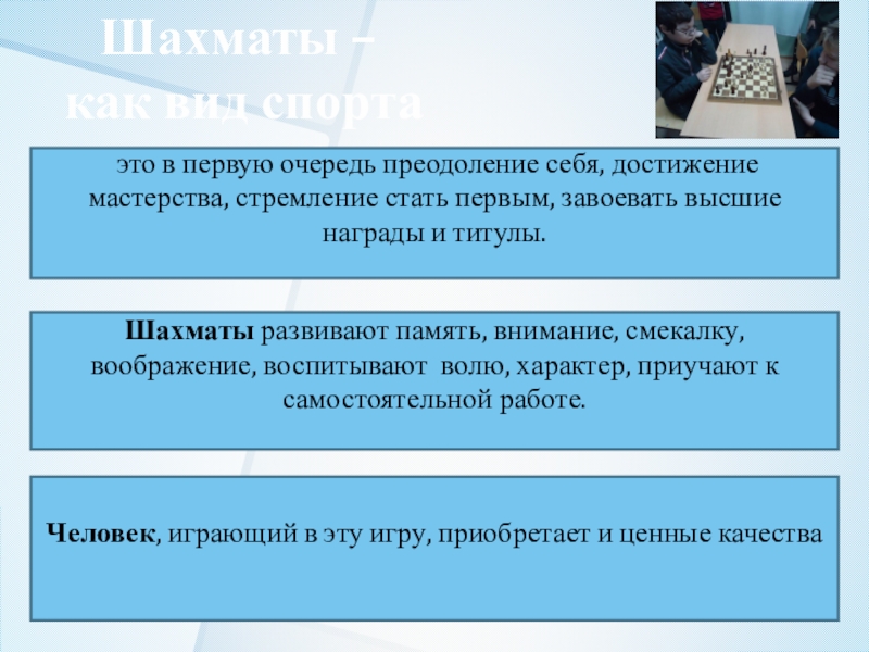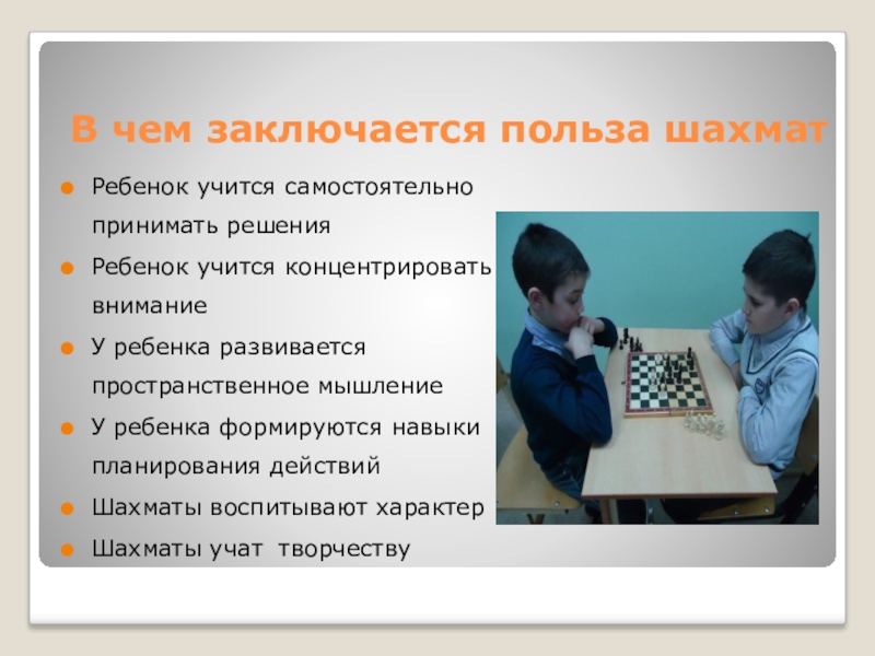 Шахматы развивают память, внимание, смекалку, воображение, воспитывают волю, характер, приучают к самостоятельной работе.