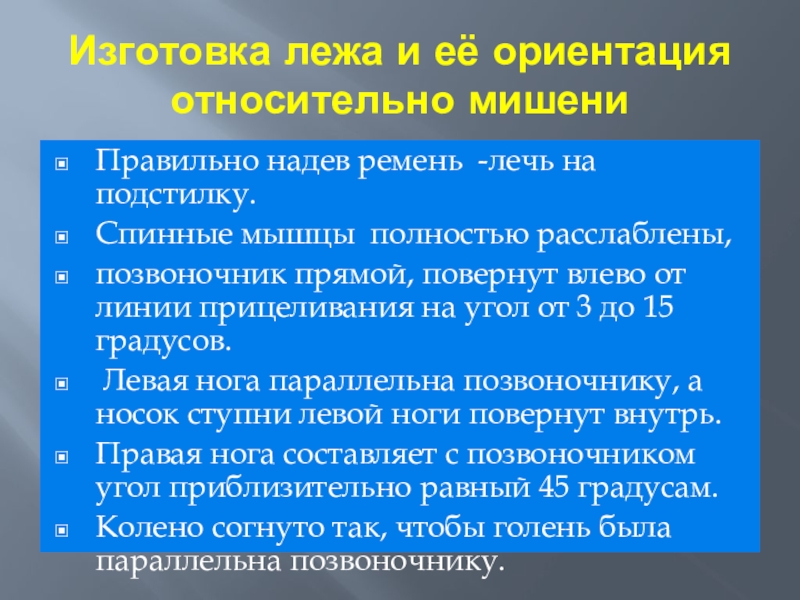 Слайд 6Изготовка лежа и её ориентация относительно мишени