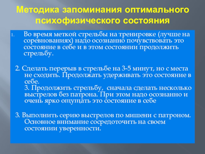 на соревнованиях) надо осознанно почувствовать это состояние в себе и в этом состоянии продолжить стрельбу.