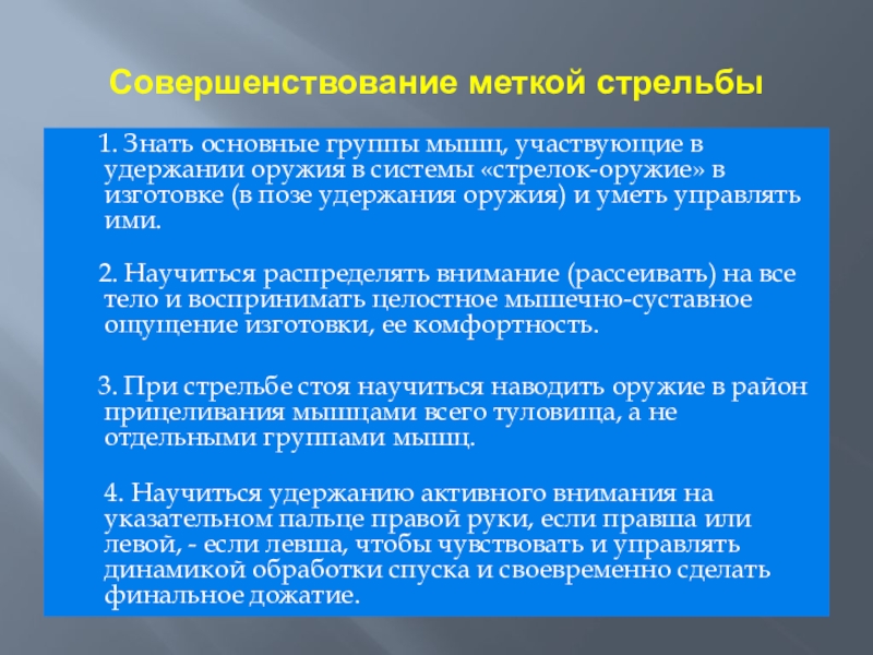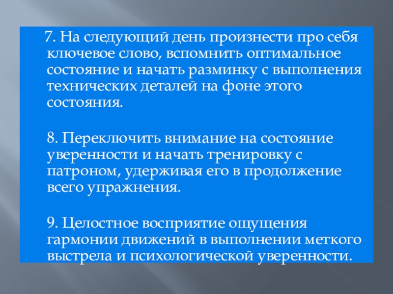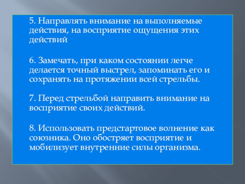 7. Перед стрельбой направить внимание на восприятие своих действий.