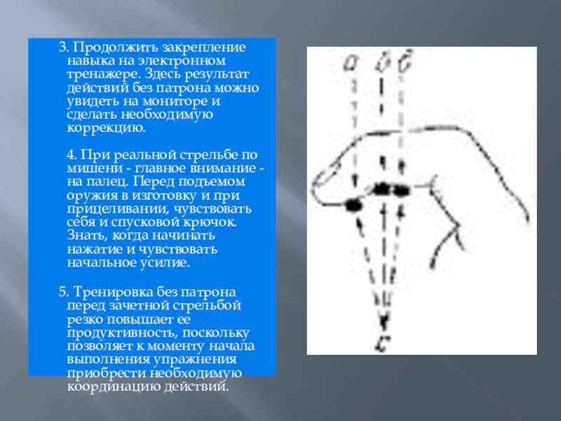 4. Научиться удержанию активного внимания на указательном пальце правой руки, если правша или левой, - если левша, чтобы чувствовать и управлять динамикой обработки спуска и своевременно сделать финальное дожатие.