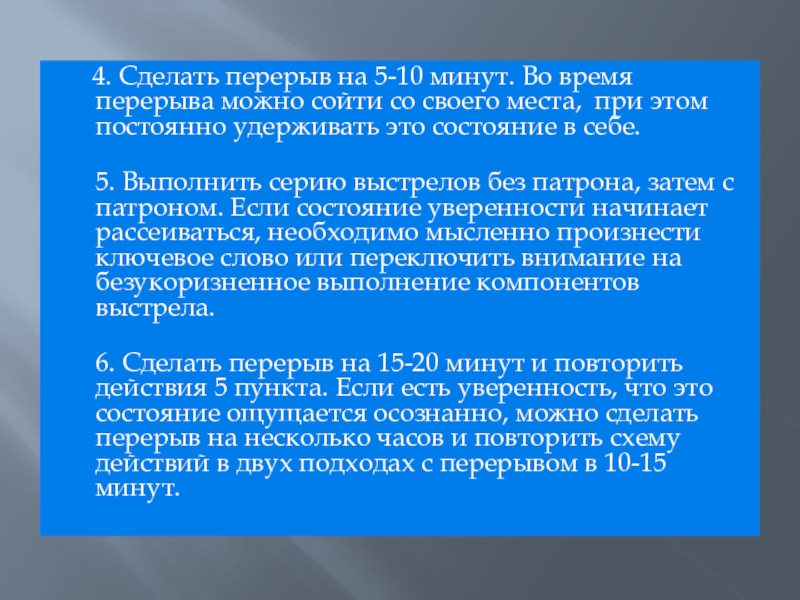 2. Сделать перерыв в стрельбе на 3-5 минут, но с места не сходить. Продолжать удерживать это состояние в себе.
