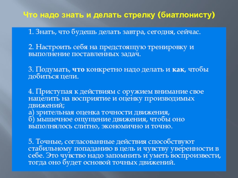 Слайд 18Что надо знать и делать стрелку (биатлонисту)