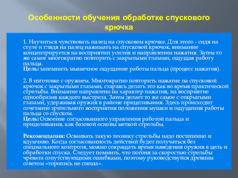 1. Научиться чувствовать палец на спусковом крючке. Для этого - сидя на стуле и глядя на палец нажимать на спусковой крючок, внимание концентрируется на восприятии усилия и направлении нажатия. Затем то же самое многократно повторить с закрытыми глазами, ощущая работу пальца.