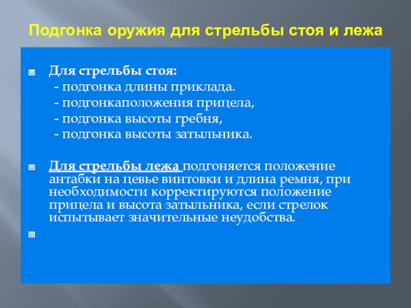 Слайд 14Подгонка оружия для стрельбы стоя и лежа