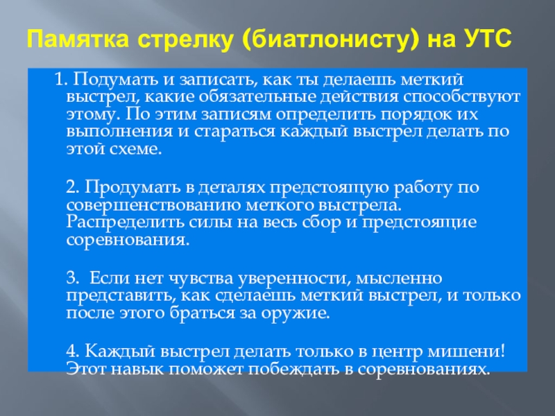 Слайд 11Памятка стрелку (биатлонисту) на УТС