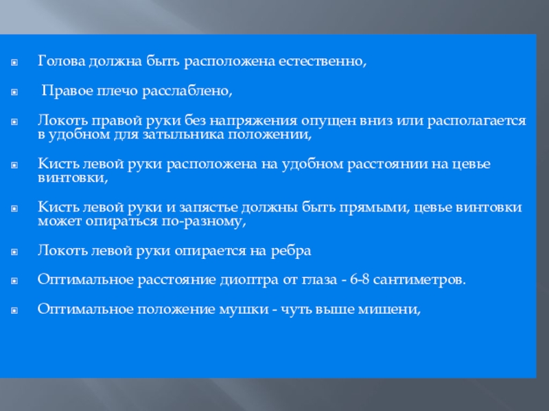 6. Замечать, при каком состоянии легче делается точный выстрел, запоминать его и сохранять на протяжении всей стрельбы.