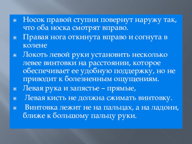 Локоть левой руки установить несколько левее винтовки на расстоянии, которое обеспечивает ее удобную поддержку, но не приводит к болезненным ощущениям.