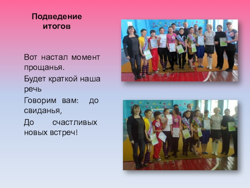 Подведение итоговВот настал момент прощанья.Будет краткой наша речьГоворим вам: до свиданья, До счастливых новых встреч!