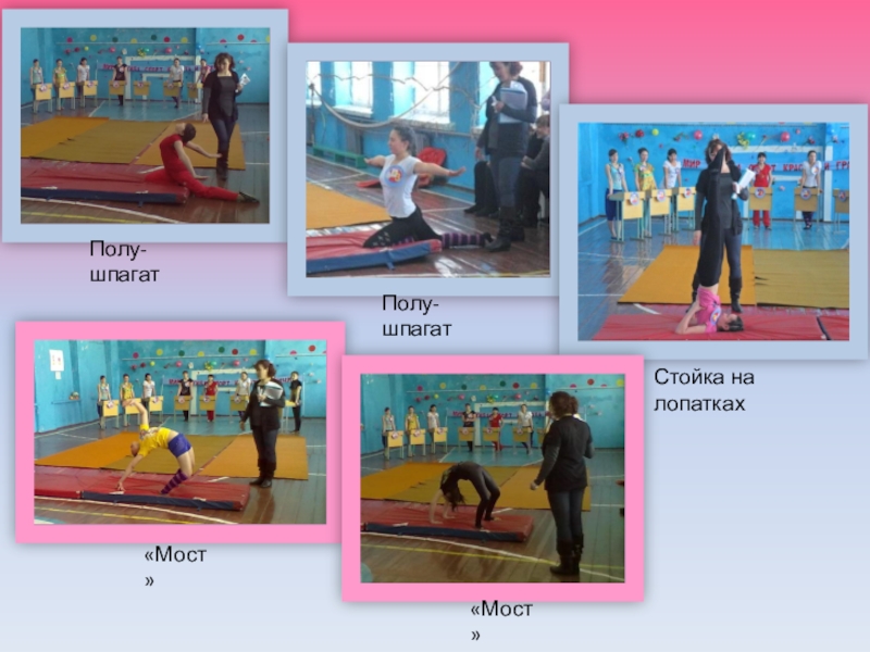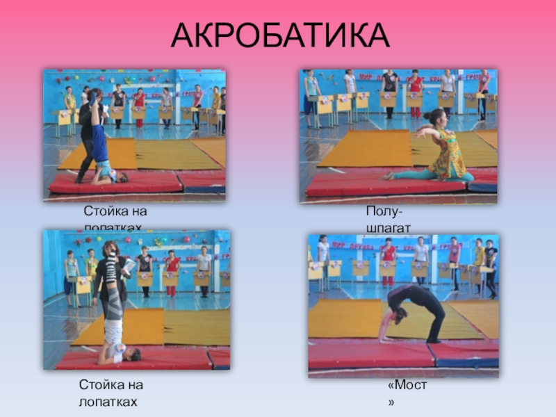 АКРОБАТИКАСтойка на лопаткахПолу-шпагатСтойка на лопатках«Мост»