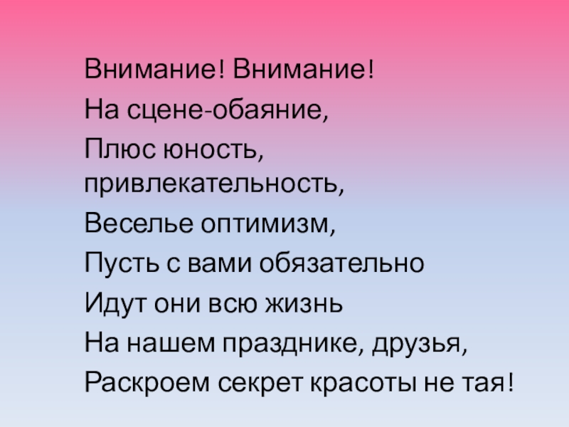 Внимание! Внимание!На сцене-обаяние,Плюс юность, привлекательность,Веселье оптимизм,Пусть с вами обязательно Идут они всю жизньНа нашем празднике, друзья, Раскроем секрет красоты не тая!