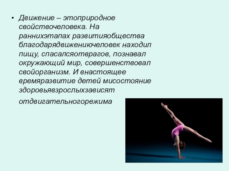 Движение – этоприродное свойствочеловека. На раннихэтапах развитияобщества благодарядвижениючеловек находил пищу, спасалсяотврагов, познавал окружающий мир, совершенствовал свойорганизм. И