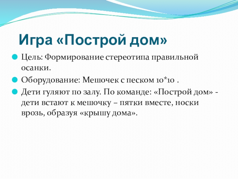 Дети гуляют по залу. По команде: «Построй дом» - дети встают к мешочку – пятки вместе, носки врозь, образуя «крышу дома».