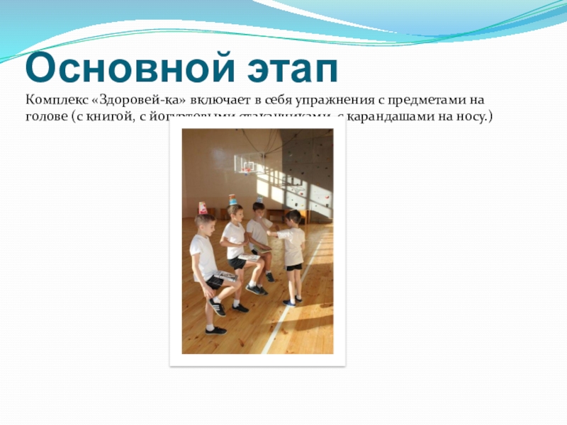 Слайд 14Комплекс «Здоровей-ка» включает в себя упражнения с предметами на голове (с